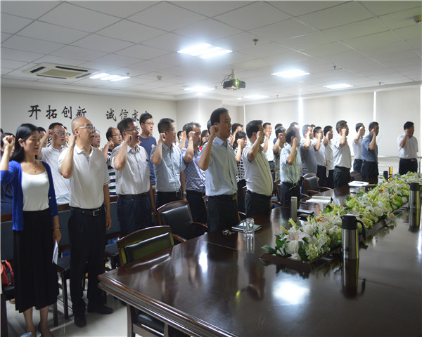 會議進行第一項,全體人員起立,唱國歌。嘹亮高昂的義勇軍進行曲響徹整個會議室、整個集團公司,歌聲振奮同志們的意志,更加堅定了對黨的信仰。
