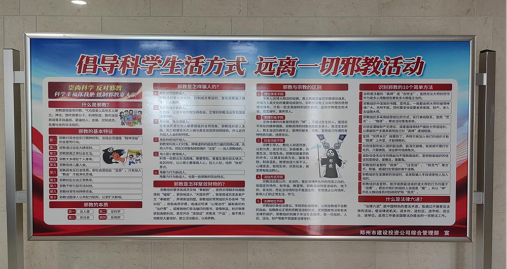 為了進(jìn)一步提高國企員工反邪教意識,認(rèn)識邪教的危害,切實(shí)增強(qiáng)自覺抵御邪教侵蝕的能力,營造積極向上、健康和諧的工作氛圍。4月25日下午,鄭州市建設(shè)投資集團(tuán)有限公司組織全體干部員工開展反對邪教宣傳活動(dòng)。利用PPT宣講、宣傳展板、網(wǎng)站、懸掛橫幅等方式,向員工宣傳邪教的種類、危害和邪教組織的種類等,引導(dǎo)國企干部職工認(rèn)清邪教本質(zhì),提高識邪、防邪、拒邪能力,筑牢反邪教思想防線,做到對邪教歪理邪說不聽、不看、不信、不傳。